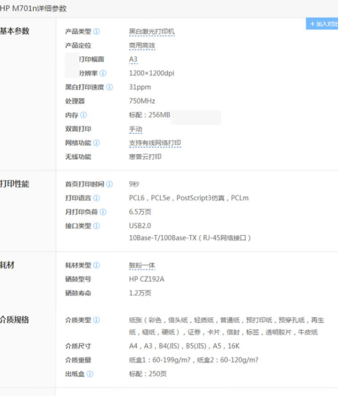 惠普(HP)LaserJet Pro M701n A3黑白激光打印機